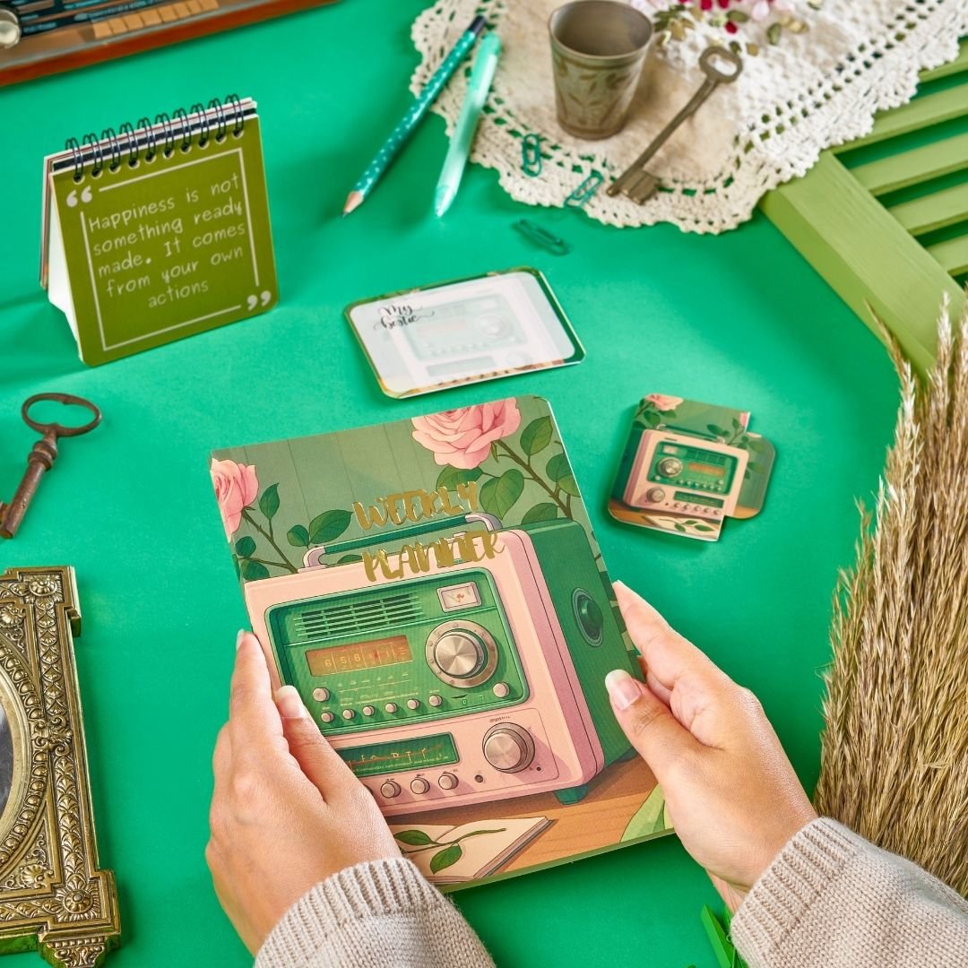 Inside the box you’ll find: a daily planner, weekly planner (52 sheets), mini inspiration stand (12 quotes), to-do list, stickers, bookmark, 2026 calendar, and 2 premium coasters — all available in 6 unique designs.
