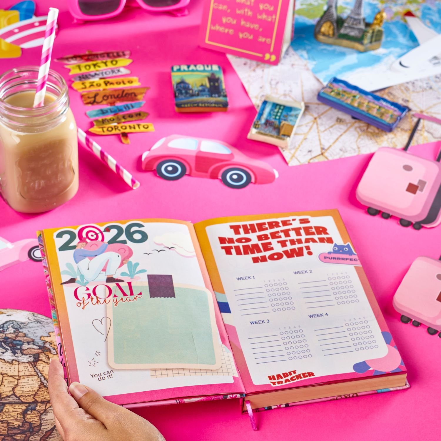 Inside the box you’ll find: a daily planner, weekly planner (52 sheets), mini inspiration stand (12 quotes), to-do list, stickers, bookmark, 2026 calendar, and 2 premium coasters — all available in 6 unique designs.